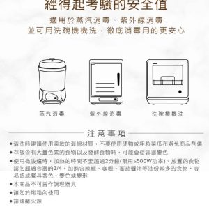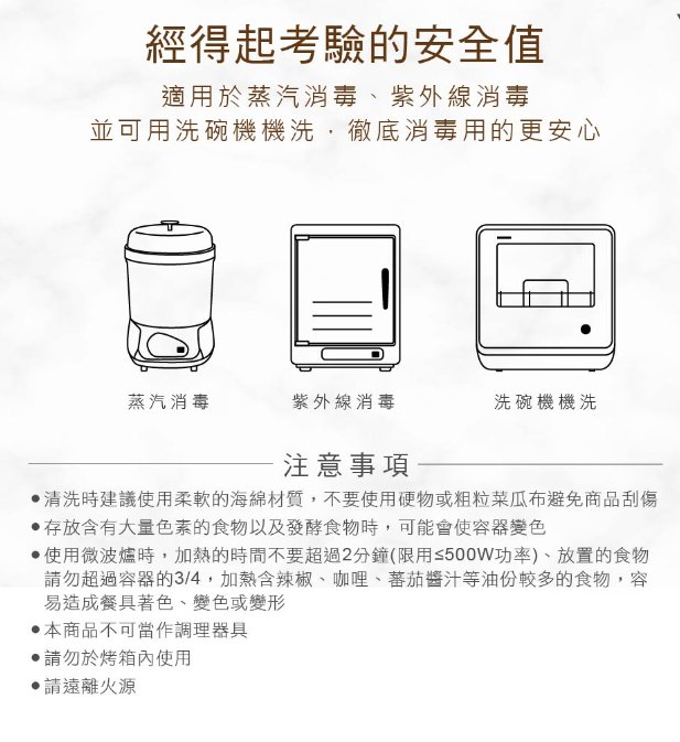 ●適用於蒸汽消毒、紫外線消毒,並可用洗碗機機洗,徹底消毒用的更安心。
