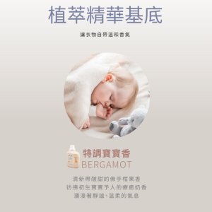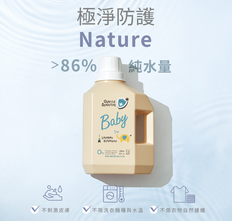 - PH8.5±1的溫和配方,不刺激寶寶稚嫩肌,無須再添加柔軟劑,也能將衣物洗淨不殘留。