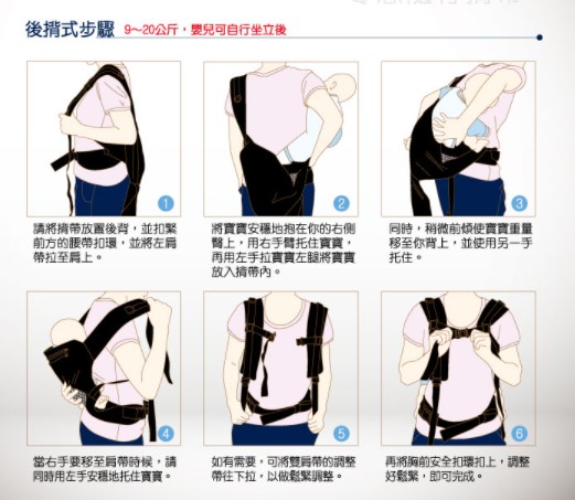 後背式 : 9~20公斤,嬰兒可自行坐立後。