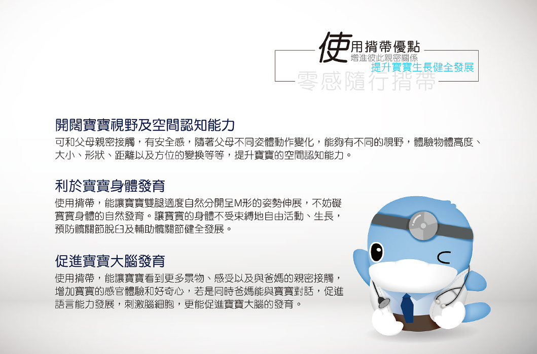 獨特寬版穩固揹帶設計,有效支撐寶寶臀部,讓寶寶大腿分開,